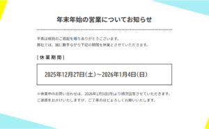 2025年度年末年始の営業についてのご案内 年末年始の営業についてお知らせ 平素は格別のご高配を賜りありがとうございます。 弊社では、誠に勝手ながら下記の期間を休業とさせていただきます。 [休業期間] 12月27日(土) […]